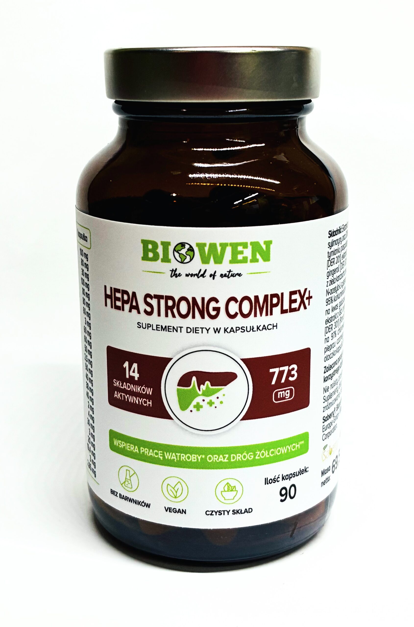 Hepa Strong Complex+ Biowen  to suplement diety stworzony z myślą o osobach chcących zadbać o zdrowie i regenerację wątroby oraz wsparcie trawienia. Zawiera aż 14 składników aktywnych, w tym 5 opatentowanych formuł: Panicin™, Saberry®, VitaCholine®, BioPerine® i Curcumin C3 Complex®. Dzięki wysokim standaryzacjom i synergicznemu działaniu ekstraktów roślinnych, aminokwasów i witamin, suplement kompleksowo wspiera ochronę komórek wątroby, procesy metaboliczne i odporność organizmu.